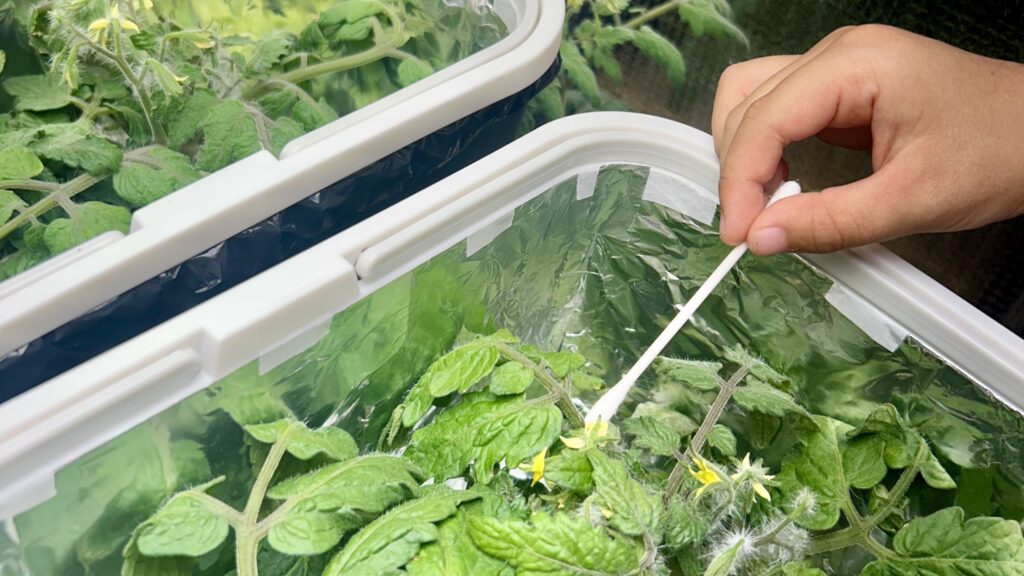 綿棒でトントンと優しく触るだけでOK。(▶︎ 室内でもできる受粉のコツはこちら)