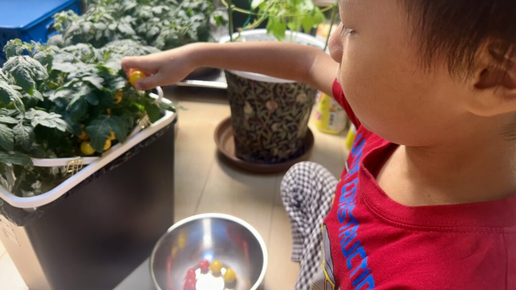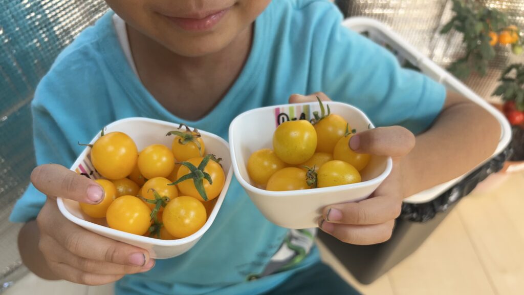 自分で育てたミニトマトをパパに「食べてみて!」と嬉しそうに言っているのをみて、達成感のようなものも感じているんだろうなと私も嬉しくなりました。