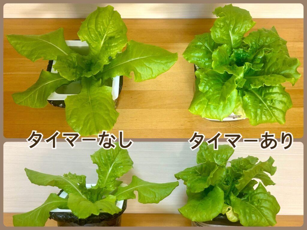 結果は明確。 タイマー管理ありは葉が厚く、枚数も多く、全体の形が整いました。 タイマーなしは徒長気味で、葉が柔らかく間延びした印象に。