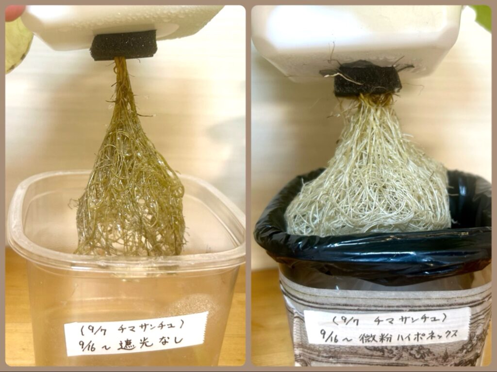 一方、遮光ありの株は根が白く、葉もいきいき。