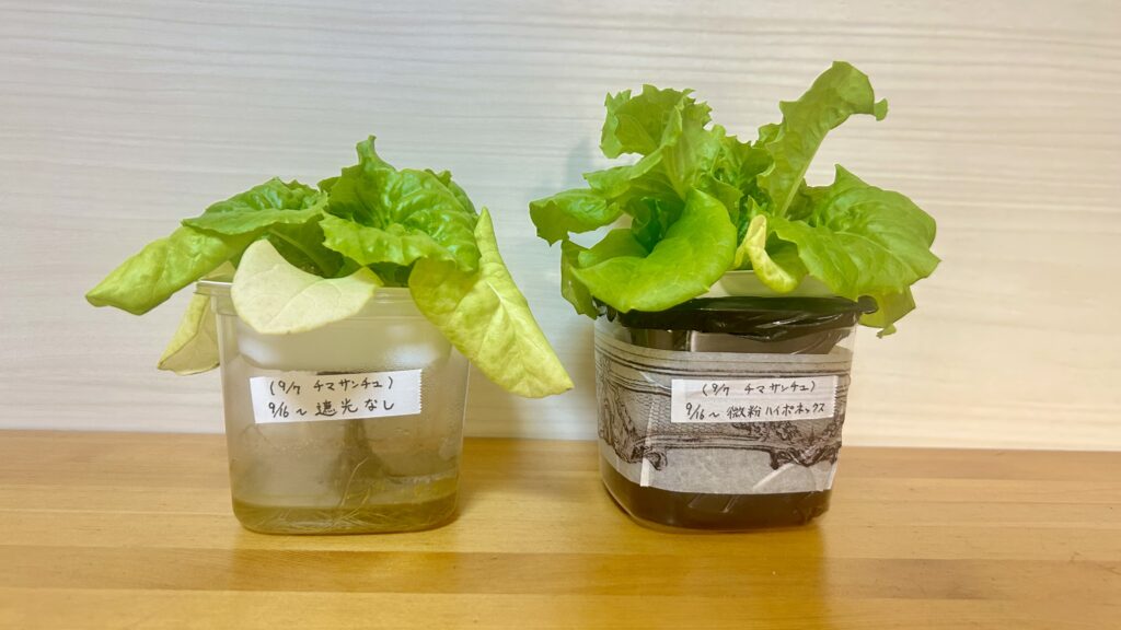 今回は、豆腐パックと味噌カップを組み合わせた手作り容器で、「遮光あり・なし」「タイマーあり・なし」 の違いを比較する実験を行いました。